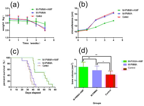 Figure 4a shows the body weight changes of rabbits in the three groups within four weeks after the establishment of the model. In the first two weeks, the weights of the three groups had no significant statistical difference (p > 0.05). One week after the model was established, the tumor-bearing hind legs began to swell. As shown in Figure 4b, the circumferences of the tumor-bearing hind legs in the three groups showed no significant difference in the first week (p > 0.05), but at the beginning of the second week, the difference became significant (p < 0.05). The condition of the rabbits worsened following lung metastases. Food intake decreased rapidly at three weeks post-model establishment in the M-PMMA and control groups, while such conditions appeared later in the PMMA + AMF group. Although all the tumor-bearing rabbits died in our experiment, the rabbits in the M-PMMA + AMF group lived longer. Figure 4c shows the morbidity-free survival curve of the three groups: the median survival time of the M-PMMA + AMF group was 51.5 days (40–75 days); the M-PMMA group was 36.5 days (20–45 days); and the control group was 34.5 days (20–42 days). A log-rank test showed that the survival time among the three groups had a significant difference (p < 0.05), and the survival time of the M-PMMA + AMF group was longer than the other two groups.