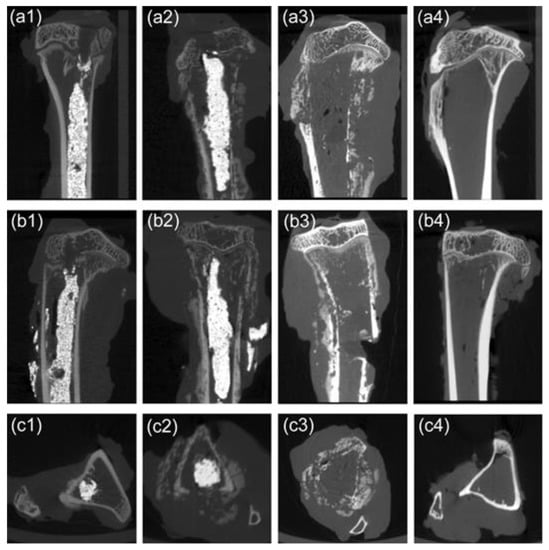 Micro-CT image of the affected lower extremities in the different groups after magnetic hyperthermia. Sagittal section (a1), coronal section (b1), and cross section (c1) of the M-PMMA + AMF group. Sagittal section (a2), coronal section (b2), and cross-section (c2) of the M-PMMA group. Sagittal section (a3), coronal section (b3), and cross-section (c3) of the control group. Sagittal section (a4), coronal section (b4), and cross-section (c4) of normal tibias.