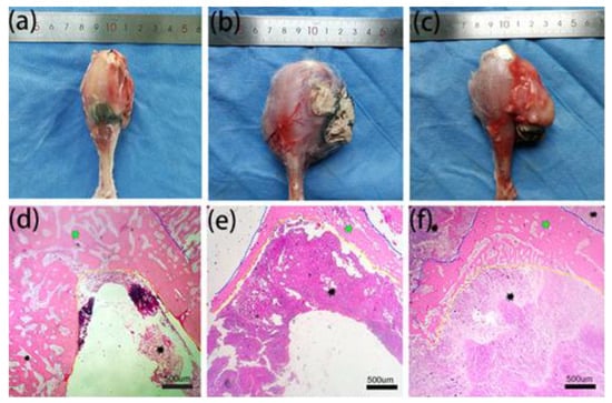 Sample photographs and hematoxylin and eosin staining of tumor-bearing tibias in the different groups. (a,d) show the M-PMMA + AMF group; (b,e), the M-PMMA group; and (c,f), the control group. The black asterisks in (d–f) are VX2 tumor cells, and the green asterisks are normal bone tissue. The bone tissue is the area between the yellow dotted line and the blue dotted line (hematoxylin and eosin stain, original magnification × 40).