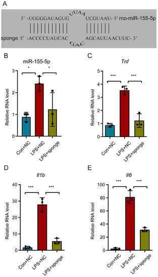 Knockdown of miR-155-5p alleviated the inflammatory storm in microglia caused by the LPS treatment. (A) The core sequence of the recombinant lentivirus-mediated miR-155-5p sponge was designed to be partially complementary to that of miR-155-5p. (B) The lentivirus-mediated miR-155-5p sponge knocked down the expression of miR-155-5p in LPS-treated microglia. n = 3, * p < 0.05, LPS + NC vs. Con + NC; * p < 0.05, LPS + sponge vs. LPS + NC. (C–E) The miR-155-5p sponge alleviated the surge of Tnf, Il1b, and Il6 induced by LPS. n = 3, *** p < 0.001, LPS + NC vs. Con + NC; *** p < 0.001, LPS + sponge vs. LPS + NC.