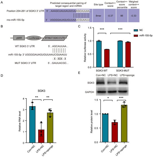 miR-155-5p suppressed the Sgk3 expression in vitro. (A) The probable pairing sequences of miR-155-5p and the 3′ untranslated region (UTR) of Sgk3 (seed region shown in grey boxes). (B) The structure of pMIR-REPORTTM Luciferase system and sequences of wild type and mutated 3′ UTR of Sgk3. (C) Dual-luciferase activity reporter assay showed that miR-155-5p mimics decreased the luciferase activity in 293T cells transfected with Sgk3-WT, but not in the MUT vector. n = 3, *** p < 0.001, Sgk3-WT + miR-155-5p vs. Sgk3-WT + NC; *** p < 0.001, Sgk3-WT + miR-155-5p vs. Sgk3-MUT + miR-155-5p. (D,E) Knockdown of miR-155-5p using a miR-155-5p sponge restored the expression of Sgk3 suppressed by LPS treatment assayed using RT-qPCR (D) and Western blot (E). n = 3, * p < 0.05, ** p < 0.01, LPS + NC vs. Con + NC; ** p < 0.01, *** p < 0.001, LPS + sponge vs. LPS + NC.