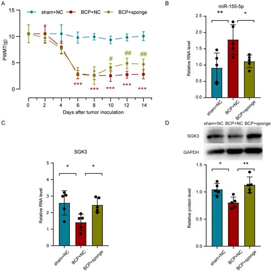 To clarify the role of miR-155-5p in bone cancer pain, the miR-155-5p sponge was administrated intrathecally in the bone cancer pain rats. A behavioral test showed that the PWMT of the BCP rats was partially recovered by inhibiting miR-155-5p (multiple comparisons: on days 6, 8, 10, 12, and 14; all adjusted p < 0.0001; BCP + NC vs. sham + NC) (on day 10, adjusted p = 0.030, BCP + NC vs. BCP + sponge) (on day 12, adjusted p = 0.0037, BCP + NC vs. BCP + sponge) (on day 14, adjusted p = 0.0100, BCP + NC vs. BCP + sponge) (Figure 6A). Then, an assay of miR-155-5p expression showed that the miR-155-5p sponge could effectively knock down miR-155-5p in the lumbar spinal cord of bone cancer pain rats (multiple comparisons: adjusted p = 0.0079, BCP + NC vs. sham + NC; adjusted p = 0.0346, BCP + NC vs. BCP + sponge; Figure 6B). Consistent with the in vitro study, inhibiting miR-155-5p restored the expression of Sgk3 suppressed in the bone cancer pain rats assayed using RT-qPCR (multiple comparisons: adjusted p = 0.0128, BCP + NC vs. sham + NC; adjusted p = 0.0238, BCP + NC vs. BCP + sponge; Figure 6C) and Western blot (multiple comparisons: adjusted p = 0.0137, BCP + NC vs. sham + NC; adjusted p = 0.0018, BCP + NC vs. BCP + sponge; Figure 6D), indicating the regulatory effect of miR-155-5p.