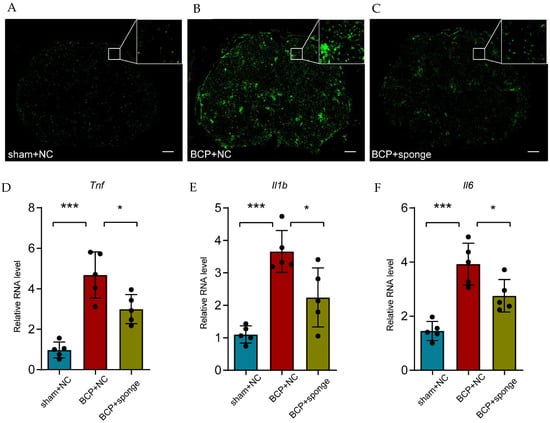Intrathecal administration of a miR-155-5p sponge alleviated microglial activation in the bone cancer pain rats. (A–C) Immunofluorescence of Iba1 showed the morphology and number of activated microglia in different treatments (scale bar: 200 μm). (D–F) The administration of a miR-155-5p sponge alleviated the inflammatory factors (i.e., Tnf, Il1b, and Il6) that were increased in the bone cancer pain condition. n = 5, *** p < 0.001 vs. the sham + NC group; * p < 0.05 vs. the BCP + NC group.