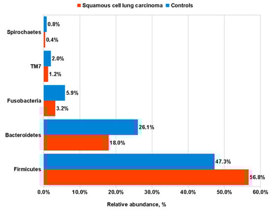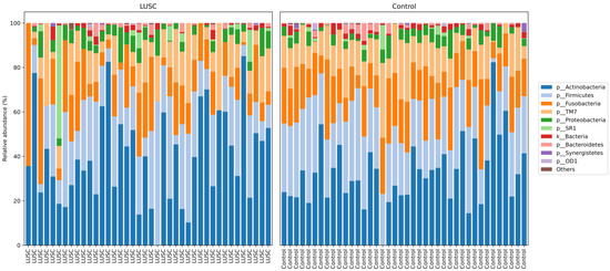 For the LUSC group, the average number of analyzed sequences was 76,776 (range: 9694−181,146). For the healthy control group, the average number of analyzed sequences was 72,613 (range: 12,537−160,232). We identified a total of 11 bacterial phyla with relative frequencies above 0.1%. The prevailing phyla in our dataset were Firmicutes, Bacteroidetes, Actinobacteria, and Proteobacteria (Figure 1), consistent with results from previous studies [21,22,31,32].