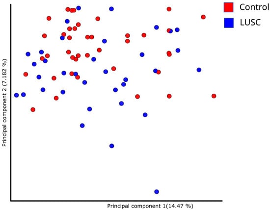 Differences in the structure of bacterial communities in sputum samples of lung cancer patients and healthy subjects are shown in Figure 2. The first two principle components explained 14.47 and 7.182% of the total variation. Compositional similarity within the phylum-level taxa was displayed among individual samples using the bar plot (Figure 1). The PERMANOVA (Adonis) test using the difference matrix, constructed by the Bray-Curtis method, showed a significant difference in the prokaryotic communities in sputum from healthy subjects and patients with LUSC (pseudo-F = 1.53; p = 0.005).