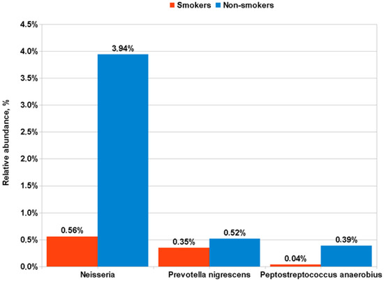 The influence of smoking status on the microbiota composition in patients with LUSC and control subjects was also investigated. For LUSC patients, no significant difference was found in the bacterial genera or species in sputum between smokers and nonsmokers. Controls differing in smoking status revealed a significant difference in the occurrence of several genera and species in the sputum. Control group smokers (Figure 4) had less Neisseria than non-smokers (0.56 ± 1.16% vs. 3.94 ± 5.63%; p = 0.00006); Fusobacterium (1.4 ± 1.55% vs. 3.39 ± 3.01%; p = 0.02); Prevotella nigrescens (0.35 ± 1.38% vs. 0.52 ± 0.68%; p = 0.01) and Peptostreptococcus Anaerobius (0.04 ± 0.1% vs. 0.39 ± 0.71%; p = 0.02). At the same time, control group smokers had more Streptobacillus in their sputum compared to nonsmokers (3.62 ± 2.8% vs. 1.92 ± 2.28%; p = 0.03).