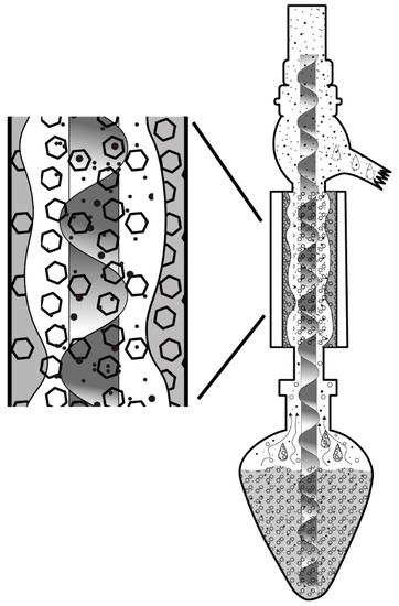By far, the method with the least potential for low-molecular-weight species loss or fractionation was the spinning-band distillation column (Figure 1). The efficacy of this method has been previously demonstrated in a study that compared PAH losses for six solvent reduction methods [46]. The spinning-band method of solvent reduction has the highest recovery of low-molecular-weight and low-boiling-point PAHs, such as naphthalene. Using a custom-made apparatus, extracts were concentrated with less than 5% loss of any of the tested 2–5-ring PAH standards. The spinning-band distillation apparatus concentrates extract in a reservoir flask that is immersed in a hot water bath on a stirring hot plate. The flask is connected to an insulated distillation column with a length of rotating threaded PTFE screw (the “band”). As the solvent vapor travels through the distillation column, the rotation of this band returns higher-molecular-weight species to the extract in the reservoir. The spinning is enabled by a metal knob at the bottom end of the PTFE screw and operated by the stirring function of the hot plate. The reservoir flask in the water bath is kept just below the boiling point of the methanol–DCM solvent mix (~50 °C) to prevent loss of low-molecular-weight PAHs.