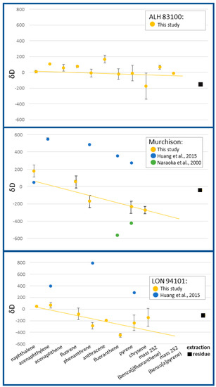 Values measured in our current study are also more enriched than those presented by Naraoka et al. [38]; however, that study used a much smaller portion of meteorite (~1/8th the sample mass used in this study) that was also extracted in a 3:1 benzene–methanol mixture and purified by short-column silica gel chromatography [47]. These differences in sample size, preparation, and extraction may have resulted in enhanced dissolution of deuterium-depleted species. It is possible the observed decreased solubility of deuterated species in a nonpolar solvent could have resulted in less of the D-enriched PAHs in the fraction analyzed, a process observed in deuterated standards [53]. Based on these comparisons for soluble aromatic molecules, this study shows that extraction methods can have a substantial effect on isotopic expression and indicates that soluble species are generally isotopically light when compared with insoluble organic matter.