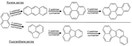 Two possible pathways for forming larger peri-condensed PAHs from smaller homologs, suggesting that isotope distribution is kinetically controlled, producing fractionation during carbon formation and cyclization that adds rings. Concept and drawing after Naraoka et al. 2000 [40].