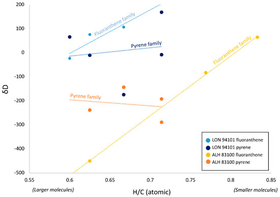 Enrichment patterns in PAHs can indicate the interstellar and protostellar environments that have been important in modification of the molecules and help provide context for the provenance of these molecules. In most cases, deuterium enrichment reactions occur because of the zero-point energy differences between a D and H atom on PAHs, which lead to C-D bonds that are slightly stronger than C-H bonds, thus causing preferential breaking of the bonds with the lighter element over the bond with the heavier element [9,41,42]. Two models of PAH alteration suggest deuterium enrichments can occur in both warm and cold regions of space [28,29]. Deuterium enrichments can occur on gas-phase PAHs over a wide range of temperatures if they are exposed to ultraviolet radiation that can drive unimolecular photodissociation. A cold origin for the D-enrichment of PAHs can occur via gas-phase ion–molecule reactions in cold dense molecular clouds or UV photolysis of PAHs in D-enriched ices. Patterns of PAH deuterium enrichment are expected to differ in these regions of space and each of these reactions should produce a distinctive signature δD composition when compared with certain structural PAH properties (Table 1).