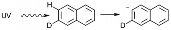 In contrast to unimolecular photodissociation, gas-phase ion–molecule reactions (Scheme 2) and ice photolysis reactions (Scheme 3) require low-temperature conditions and are thus more likely in pre-accretionary environments. These reactions are widely accepted as a deuterium enrichment mechanism for many species in the interstellar medium [41,58]. The gas-phase ion–molecule enrichment mechanism is a two-step process where, first, a PAH molecule in dense interstellar clouds will become charged by reacting with a H2D+ ion (Scheme 2). An electron then neutralizes the charge while eliminating the extra D or H atom. As discussed before, the C-D bond is stronger than C-H, resulting in a gradual accumulation of deuterium at affected bonding sites.
