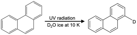 Similarly, the process of enrichment by photolysis in ices is the energetic processing of molecules in dense clouds of interstellar ices by cosmic rays that include the diffuse UV field in the interstellar medium as well as UV photons produced by stars forming within the cloud [59]. As deuterium-rich ices created by gas–grain reactions [60] are irradiated and warmed, complex chemistry occurs within the molecules condensed in these ices leading to bond breakage, radical and ion formation, and possible molecule destruction [28]. These molecules could include PAHs previously D-enriched by other reactions that have concentrated in the ice mantles where further D-enrichment will occur by D-H exchange reactions at nonlabile locations during the ice phase irradiation process [28,61] (Scheme 3).