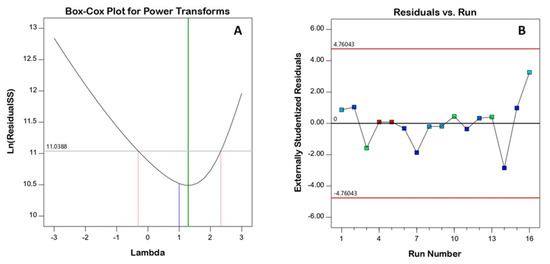 Figure 1 depicts diagnostic plots that assess the goodness of fit of the chosen model. Figure 1A shows a Box–Cox plot for power transforms with a best lambda (λ) value of 1.29 (represented by the green line). The computed confidence interval around this is −0.31–2.33 (represented by the red lines); the computed confidence interval includes the value 1 (currently represented by the blue line); thus, no specific data transformation is recommended [25]. Furthermore, the color points in the externally studentized residuals vs. the run number plot were distributed at random within the limits, indicating no constant error (Figure 1B).