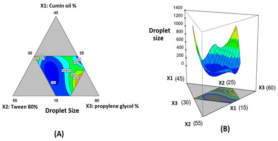 The effect of mixture components on the droplet size of 2ME-SNEDDS is depicted in 2D contour plot (A) and 3D surface plot (B).