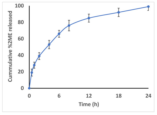 In vitro release pattern of optimized 2ME-SNEDDS after 24 h; activated dialysis bag method was used in a dissolution chamber where the system was maintained at 100 rpm and 37 ± 0.5 °C. The release profile was determined in phosphate buffer pH 7.4 (physiological pH) in sink condition containing 0.1% tween 80.