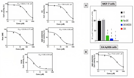 (A) Concentration–response curves of V1, V2, raw 2ME, 2ME-SNEDDS, and DOX in MCF-7 cells. (B) Concentration–response curve of 2ME-SNEDDS in EA.hy926 cells. Results are presented as mean ± SD (n = 6). # Significantly different from V1 at p < 0.05, $ significantly different from V2 at p < 0.05, † significantly different from raw 2ME at p < 0.05.