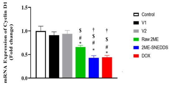 mRNA expressions of cyclin D1 in MCF-7 cells after incubation with V1, V2, raw 2ME, 2ME-SNEDDS, and DOX. Results are presented as mean ± SD (n = 6). * Significantly different from control at p < 0.05, # V1 at p < 0.05, $ significantly different from V2 at p < 0.05, † significantly different from raw 2ME at p < 0.05.