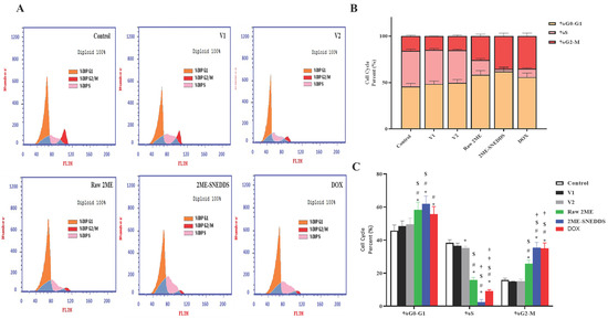 Flow cytometric analysis of cell cycle distribution of PI-stained MCF-7 cells. (A) Representative flow cytometry histograms after treatment with V1, V2, raw 2ME, 2ME-SNEDDS, and DOX. (B) Cumulative bar chart showing the percentage of cells in the G0/G1, S, and G2/M phases of the cell cycle. (C) Graphic presentation of the percentages of cell cycle phases. Results are presented as mean ± SD (n = 6). * Significantly different from control at p < 0.05, # significantly different from V1 at p < 0.05, $ significantly different from V2 at p < 0.05, † significantly different from raw 2ME at p < 0.05, ‡ significantly different from 2ME-SNEDDS at p < 0.05.