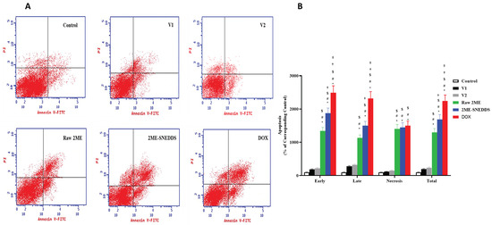 Flow cytometric analysis of early (lower left quadrant) and late apoptosis (lower right quadrant) and necrosis (upper right quadrant) using annexin V-FITC/PI double staining in MCF-7 cells following challenge with V1, V2, raw 2ME, 2ME-SNEDDS, and DOX. (A) Representative flow cytometric dot plots, (B) graphic presentation of early apoptosis, late apoptosis, necrosis, and total MCF-7 cells death. Results are presented as mean ± SD (n = 6). * Significantly different from control at p < 0.05, # significantly different from V1 at p < 0.05, $ significantly different from V2 at p < 0.05, † significantly different from raw 2ME at p < 0.05, ‡ significantly different from 2ME-SNEDDS at p < 0.05.