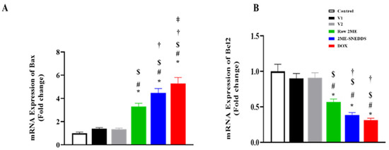 mRNA expressions of Bax (A), and Bcl-2 (B) in MCF-7 cells after incubation with V1, V2, raw 2ME, 2ME-SNEDDS, and DOX. Results are presented as mean ± SD (n = 6). * Significantly different from control at p < 0.05, # V1 at p < 0.05, $ significantly different from V2 at p < 0.05, † significantly different from raw 2ME at p < 0.05, ǂ significantly different from 2ME-SNEDDS at p < 0.05.