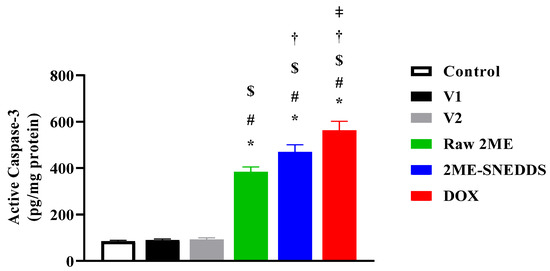 Active caspase-3 concentrations in MCF-7 cells treated with V1, V2, raw 2ME, 2ME-SNEDDS, and DOX. Results are presented as mean ± SD (n = 6). * Significantly different from control at p < 0.05, # significantly different from V1 at p < 0.05, $ significantly different from V2 at p < 0.05, † significantly different from raw 2ME at p < 0.05, ǂ significantly different from 2ME-SNEDDS at p < 0.05.