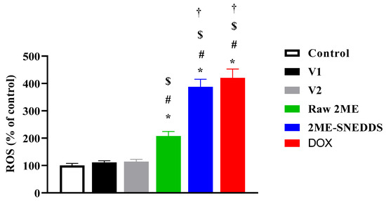 Generation of ROS in MCF-7 cells incubated with V1, V2, raw 2ME, 2ME-SNEDDS, and DOX. Results are presented as mean ± SD (n = 6). * Significantly different from control at p < 0.05, # significantly different from V1 at p < 0.05, $ significantly different from V2 at p < 0.05, † significantly different from raw 2ME at p < 0.05.