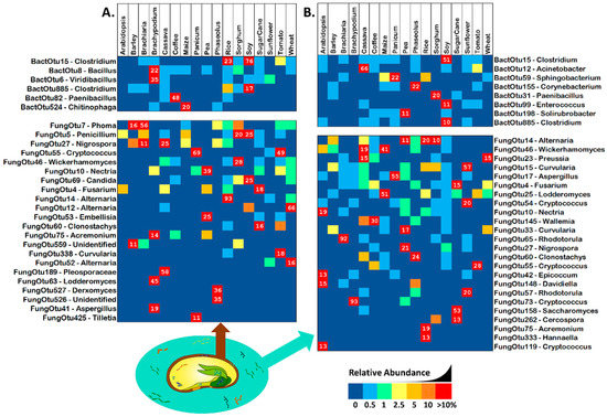 Uncommon and abundant (with a relative proportion of greater than 10% in at least one sample) OTUs of bacterial 16S and fungal ITS in (A) seeds and (B) spermospheres. Uncommon OTUs were defined as having an occupancy of less than 53% across seeds or spermospheres of the 17 different plant species. Bacterial OTUs are shown in the top blocks, fungal OTUs on the bottom blocks. Next to each OTU ID# is the predicted genus of that sequence. OTU read proportion is represented by color as shown in the legend, with red squares also showing the proportion as a number.
