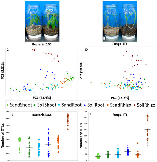 Different plant species, including cassava (Figure 2A) and sorghum (Figure 2B), were grown in jars containing sterile sand or field soil. To relate the microbial diversity in different tissue types, OTU counts (summed and averaged across reps) were transformed into presence–absence data, then ordinated by principle component analysis of covariance (n − 1) and visualized as scatterplots grouped by tissue type and substrate (Figure 2C,D). The number of different OTUs per sample was also plotted by substrate and tissue type, allowing for visualization of differences in diversity amongst bacterial (Figure 2E) and fungal (Figure 2F) populations. The most obvious separation between groups is evident for both bacteria and fungi in rhizospheres of soil-grown plants, which are clearly distinct from sterile sand ground plants. About half of either bacterial or fungal root samples from plants grown on soil were also observed to shift away from sterile sand root samples. There was no clear difference in PCAs for either bacterial or fungal diversity in sand and soil grown shoots.