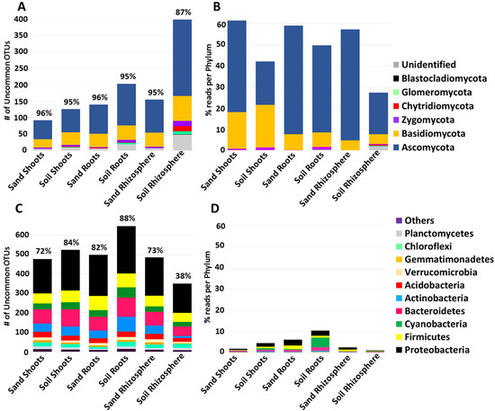 Phylum-level classification of uncommon OTU diversity and read abundance for fungi (A,B) and bacteria (C,D) in shoots, roots and rhizospheres. Uncommon OTUs were those that were found in 9 or fewer of the 17 plant species and were calculated by addition across all plant species per sample type. Percentage of uncommon versus total OTUs in each sample type is indicated above each bar. Read proportion per phylum was the result of averaging the number of reads in uncommon OTUs across all plant species. OTU and read taxonomy are indicated by coloring according to the legends at the right.