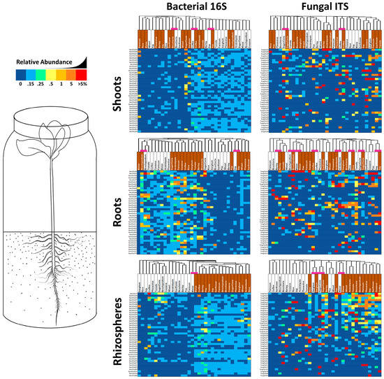 The 40 most abundant yet uncommon OTUs of fungal ITS and bacterial 16S in shoots, roots and rhizospheres of 17 different plant species grown in sealed jars on either field soil or sterile sand. Reads were summed across repetitions and then transformed into relative percentages. Sand-grown plants are labelled in white, while soil-grown samples have a brown label. Samples were organized by Bray–Curtis dissimilarity and those that grouped by plant species are highlighted by a purple block atop the column. Square shading is by percentage value, with dark blue being 0%, up to 0.1% being light blue, between 0.1–0.25% being green, 0.25–0.5% being light yellow, 0.5–1% being dark yellow, 1–5% being orange and greater than 5% being red.