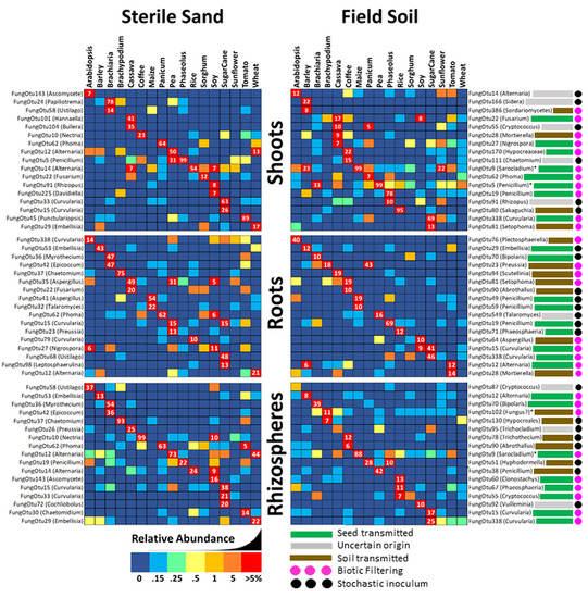 The 17 most abundant fungal ITS OTUs occurring in less than 53% of shoot, root and rhizosphere samples fro m 17 different plant species grown in sealed jars on sterile sand or farm soil. Uncommon reads were added across repetitions and transformed into relative percentages, and the most abundant OTU for each plant is shown. Rows with an asterisk are represented in more than 53% of sampl es; however, they appeared to show a large increase in abundance in one specific plant. Cells are shaded by percentage value, with 0% being dark blue, up to 0.15% being light blue, between 0.1–0.25% being green, 0.25–0.5% being light yellow, 0.5–1% being dark yellow, 1–5% being orange and greater than 5% being red with white numbers inside. Predicted inoculum source in soil-grown plants is shown as gray (unknown), green (seed) or brown (soil) colored bars, while pink dots indicate plants selectively filtering for the fungus and black dots indicate a stochastic supply of inoculum.
