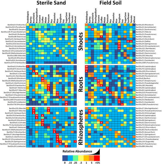 List of the 17 most abundant yet uncommon bacterial 16S OTUs (occurring at a level of more than 0.15% in 9 or fewer different plant species) in shoots, roots and rhizospheres of 17 different plant species raised inside sealed jars on either farm soil or sterile sand. Reads from soil-grown samples were added across repetitions and transformed into relative percentages, and the most abundant OTU for each plant sample is shown. Cells are shaded by percentage value with 0% being dark blue, up to 0.15% being light blue, between 0.1–0.25% being green, 0.25–0.5% being light yellow, 0.5–1% being dark yellow, 1–5% being orange and greater than 5% being red with white numbers inside.