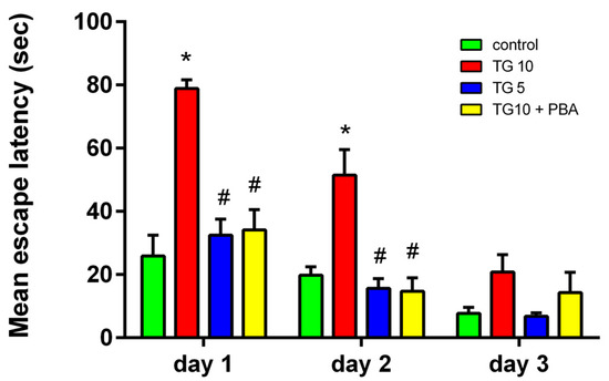 Effects of TG (5, 10 µg) and TG10 + PBA on the escape latency to arrive at a hidden platform in a water maze as a function of the training day. These data reveal that the escape latency is longer in TG10-treated animals during days 1 and 2 of training. * p < 0.001 versus the control group. # p < 0.001 versus the TG10 group. Data are represented as mean ± SEM (N = 7–9). Thapsigargin (TG), 4-Phenylbutyric acid (PBA).