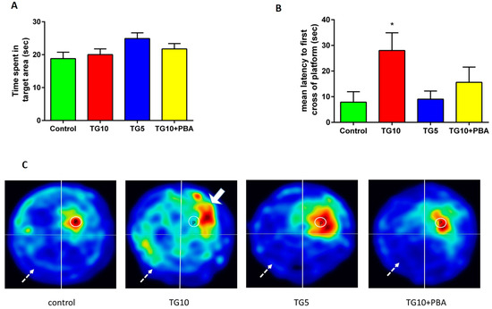 To evaluate memory retrieval, rats were assessed using a probe test. One-way analysis of the time spent in the target quadrant failed to show a significant difference between the groups (F (3, 28) = 2.397, p = 0.0892) (Figure 3A). Another criterion extracted in the probe test was the latency to reach the platform for the first time. Here, one-way ANOVA showed a significant difference (F (3, 28) = 3.350, p < 0.05) between the groups (Figure 3B). In the next step, post-hoc comparisons by Tukey’s test revealed a significant (p < 0.05) difference between TG10-treated rats and the control group, but this was not the case for the control and TG5 and TG10 + PBA groups.