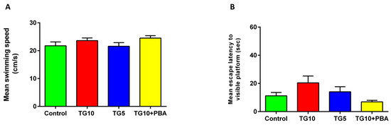 Effects of TG (5, 10 µg) and TG10 + PBA on the mean of (A) the animals’ swimming speeds and (B) the animals’ abilities to locate the visible platform. There was no observable difference between the groups. Data are represented as mean ± SEM (N = 7–9). Thapsigargin (TG), 4-Phenylbutyric acid (PBA).