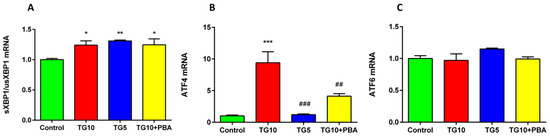Effects of TG (5 & 10 µg) and TG10 + PBA on (A) sXBP1/usXBP1 mRNA expression, (B) ATF4 mRNA expression, and (C) ATF6 mRNA expression. * p < 0.05, ** p < 0.01, and *** p < 0.001 versus the control group. ## p < 0.01 and ### p < 0.001 versus the TG10 group. Data are represented as mean ± SEM (N = 3–4). Thapsigargin (TG), 4-Phenylbutyric acid (PBA).