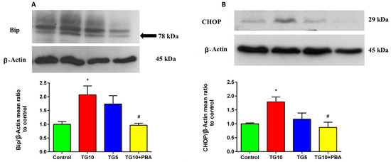 Effects of TG (5, 10 µg) and TG10 + PBA on (A) Bip and (B) CHOP. * p < 0.05 versus the control group. # p < 0.05 versus the TG10 group. Data are represented as mean ± SEM (N = 4). For clarity, the background to panel A was made lighter in Photoshop; full uncropped blots are provided as Supplementary Material. Thapsigargin (TG), 4-Phenylbutyric acid (PBA).