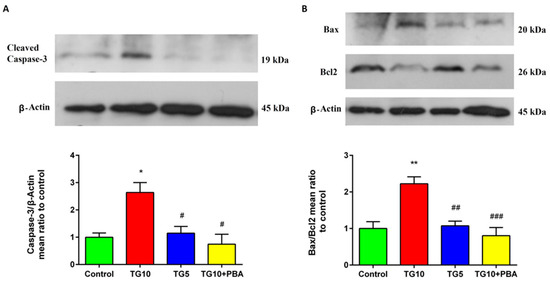 Effects of TG (5, 10 µg) and TG10 + PBA on (A) the caspase-3 and (B) Bax/Bcl2. * p < 0.05 and ** p < 0.01 versus the control group. # p < 0.05, ## p < 0.01 and ### p < 0.001 versus the TG10 group. Data are represented as mean ± SEM (N = 4). The representative blots for Figure 7 and Figure 9A were obtained from the same gel, therefore the β-Actin blot represented in these figures is the same. Thapsigargin (TG), 4-Phenylbutyric acid (PBA).