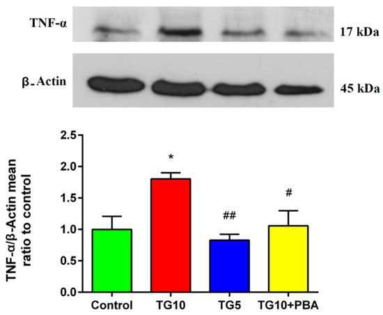 To explore the relationship between inflammation and central, induced ER stress, we assessed TNF-α protein expression. One-way ANOVA showed a significant difference in TNF-α between the groups (F (3, 12) = 6.239, p = 0.0085). In addition, Tukey’s post-hoc test showed that the content of hippocampal TNF-α increased in the TG10 group versus the others. There was no remarkable difference between the TG5, TG10 + PBA, and control groups. However, the TG5 and TG10 + PBA groups displaced a meaningful reduction in TNF-α versus the TG10 group (Figure 8).