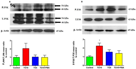 Effects of TG (5, 10 µg) and TG10 + PBA on (A) JNK and (B) P38. * p < 0.05 versus the control group. Data are presented as mean ± SEM (N = 4). Please note that since representative blots for Figure 7 and Figure 9A were obtained from the same gel, the β-Actin blot represented in these figures are the same. For clarity, the background to panel A was made lighter in Photoshop. Full uncropped blots are provided as Supplementary Material. Thapsigargin (TG), 4-Phenylbutyric acid (PBA).