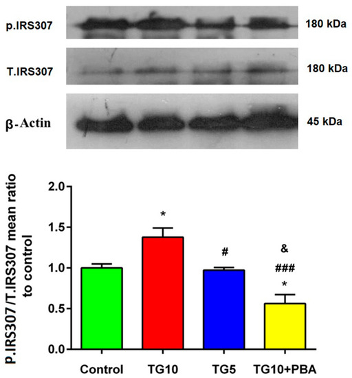 Western blot analysis revealing the impacts of TG dosages (10, 5) administration on IRS1307. * p < 0.05 versus the control group. # p < 0.05 and ### p < 0.001 versus the TG10 group. & p < 0.05 versus TG5. Data are presented as mean ± SEM (N = 4). Thapsigargin (TG), 4-Phenylbutyric acid (PBA).