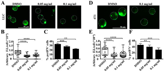 Extracts of mangosteen pericarps dose-dependently suppress periFN assembly on suspended tumor cells. (A) Fluorescence immunostaining for periFN that was assembled on suspended LLC tumor cells in the absence or presence of various concentrations, as indicated, of extracts of mangosteen pericarps (MP extracts). (B) Quantification of the arbitrary fluorescence intensity (F.I.)/cell for the images in (A). (C) Quantification of the immunostained cells in (A) with FACS analysis. (D–F) Similar fluorescence staining and quantifications for 4T1 suspended tumor cells as performed in (A–C) for LLC cells. **, p < 0.01; ***, p < 0.001; ****, p < 0.0001.