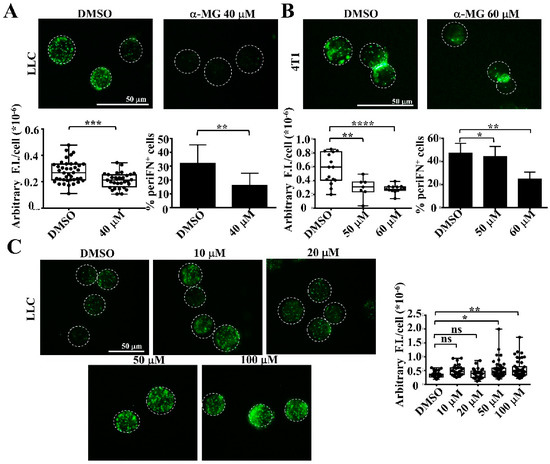 α-MG suppresses periFN assembly on suspended tumor cells. (A) Fluorescence immunostaining for periFN that was assembled on suspended LLC tumor cells in the absence or presence of 40 μM of α-MG (upper panel). The quantifications of the arbitrary fluorescence intensity (F.I.)/cell for the images (lower left panel) and FACS analysis for the immunostained cells (lower right panel). (B) Similar fluorescence immunostaining and quantifications for 4T1 suspended tumor cells as performed in (A–C) for LLC cells. (C) Fluorescence immunostaining for periFN that was assembled on suspended LLC tumor cells in the absence or presence of various concentrations, as indicated, of Xanthone and the quantifications of the arbitrary fluorescence intensity (F.I.)/cell for the images. *, p < 0.05; **, p < 0.01; ***, p < 0.001; ****, p < 0.0001; ns, no significance.