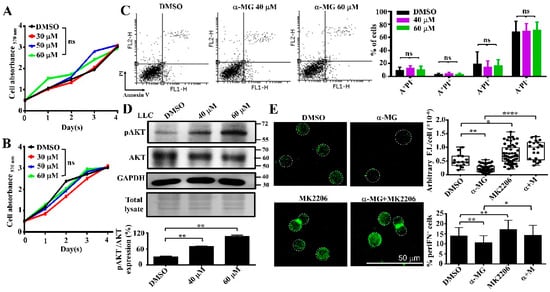 The inhibitory effect of α-MG on periFN assembly on suspended tumor cells could be due to reduced cell viability that disables the suspended tumor cells from assembling periFN. In order to test this possibility, we first treated suspended LLC (Figure 3A) and 4T1 (Figure 3B) cells with α-MG for 2 h before seeding cells in 48-well microplates for cell proliferation assays. We showed that the viabilities and proliferative activities of suspended cells treated with all concentrations of α-MG were not changed as compared with cells treated with DMSO vehicle (Figure 3A,B). Next, we tested whether α-MG triggers necrosis and/or apoptosis of tumor cells in suspension for 24 h. Employing PI/Annexin V apoptosis assays, we showed that no significant cell death (neither necrosis nor apoptosis) of LLC cells was induced at either 40 or 60 μM α-MG (Figure 3C), altogether, suggesting that the inhibitory effect of α-MG on periFN assembly on suspended tumor cells is not due to reduced viability and induced cell death. These results were highly reminiscent of those of another study which showed that pterostilbene increases AKT activity in suspended tumor cells, leading to cell survival signaling via the AKT/ERK axis [14]. To examine such phenomenon is also true for the unchanged viability with α-MG treatment, we treated suspended LLC cells with α-MG for 2 h and subjected cell lysates to western blotting for AKT phosphorylation and total AKT. We found that AKT phosphorylation was induced by α-MG in a dose-dependent manner (Figure 3D), rationalizing why the viability of suspended was not affected by α-MG, which is reportedly potent in triggering apoptosis of attached tumor cells [27]. Finally, we combined α-MG and AKT inhibitor MK2206 for treating tumor cells and found that the suppressed periFN assembly was restored (Figure 3E), suggesting that α-MG suppresses periFN assembly on suspended tumor cells via enhanced AKT activity.
