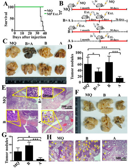 Now that we showed α-MG is the major component in MP extracts responsible for the suppression of periFN-promoted tumor metastasis, we were next interested in knowing whether MP extracts could serve as a nutraceutical to exert not only therapeutic but also prophylactic effects on metastatic suppression. To begin with, we simply performed animal survival assays and tested the effect of oral gavage with drinking water (MQ) or MP extracts thrice a week right after intravenous inoculation of LLC cells. Mice that orally received MP extracts had significantly prolonged survival compared with mice that received MQ (Figure 5A), clearly indicative of a therapeutic effect of MP extracts as a nutraceutical regime. We further designed and evaluated the therapeutic and prophylactic effects of orally administered MP extracts on lung metastasis of tumor cells (Figure 5B). Expectedly, compared with mice receiving MQ, oral gavage with MP extracts thrice a week right after intravenous LLC cell inoculation drastically suppressed lung metastasis, nodule numbers in the mouse lungs, and metastatic tumor lesions (Figure 5C–E: MQ and After (A)), confirming that MP extracts can serve as a nutraceutical to therapeutically treat tumor cells in the circulation via controlling periFN on suspended tumor cells and in distant tissues most likely via exerting cell apoptosis and necrosis effects (Figure 5A,E). Unfortunately, when MP extracts were orally given to naïve mice thrice a week for one month and the MP extract oral gavage was stopped right before tumor inoculation, the MP extracts did not only lose the anti-metastatic potency but, conversely, slightly increased lung metastasis (Figure 5C–E: MQ and Before (B)), suggesting that the MP extracts are not suitable to serve as a prophylactic regime before the presence of tumor cells in the circulation to prevent lung metastasis. Moreover, when mice only orally received MP extracts for two days before and continuously for two days after intravenous LLC cell inoculation, despite the fact that MP extracts sustained anti-metastatic effect (Figure 5C–E: MQ and Before + After (B + A)), but the inhibitory potency was significantly reduced (Figure 5C–E: B + A and A), reconfirming that MP extracts are absolutely inappropriate to be given orally before the presence of tumor cells in the circulation. When we performed similar experimental metastasis animal models for 4T1 tumor metastasis in the lungs, we yielded the same conclusion as for LLC cells (Figure 5F–H).