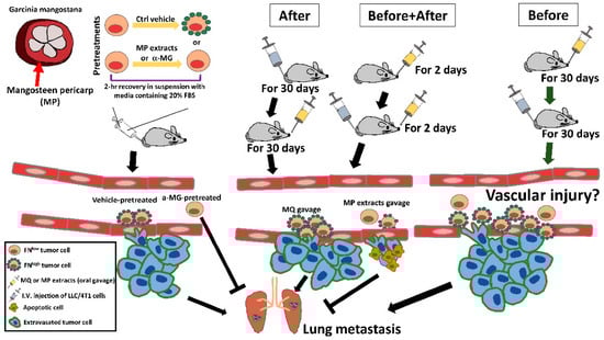 In summary, our results suggest that MP extracts or the major component α-MG in MP extracts, in spite of being unsuitable for prophylaxis, may therapeutically serve as a potent anti-metastatic nutraceutical for suppressing lung metastasis of blood-borne tumor cells (Figure 6).