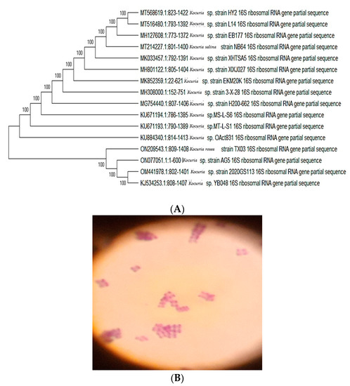 (A) Phylogenetic tree according to 16S rRNA gene sequencing, illustrating the phylogenetic relationship of Kocuria sp. within representative species of the genus Bacillus. (B) Gram-positive stain Kocuria sp. strain AG5.