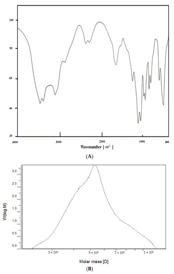 The FTIR Spectrum of EPSR5 revealing the main functional groups (A), and the Gel permeation chromatography analysis of EPSR5 (B).