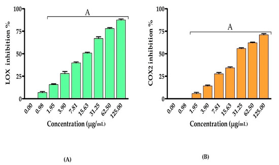 According to these findings, we wanted to explore the EPSR5 anti-inflammatory action by testing its inhibitory effectiveness against COX-2 and 5-LOX enzymes [70]. Anti-inflammatory activity of EPSR5 was estimated by assessing the changes in the activities of lipoxygenase (LOX) and cyclooxygenase (COX-2) (Figure 4). The average IC50 of EPSR5 on the LOX and COX-2 were 15.39 and 28.06 µg/mL, respectively. A dose-dependent elevation in the inhibition of LOX and COX-2 activities was observed by increasing the concentration of EPSR5.