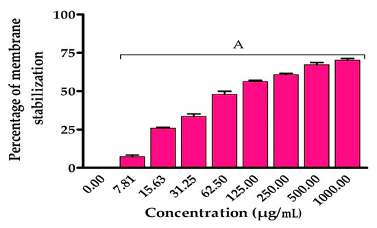 Percentage of membrane stabilization by EPSR5. Each bar represents mean ± SD of triplicate measurements. Bars of the similar letters differ insignificantly (p > 0.05), but those that have different letters differ significantly (p < 0.05).